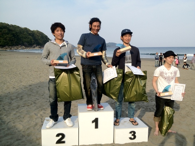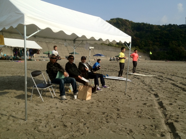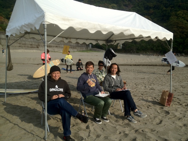ハワイからKirby Fukunaga、地元プロ中山“matchi”徳彦くん、宮崎から窪田聡プロもかけつけ、MCにはNob Surf Gallary 新谷オーナー。