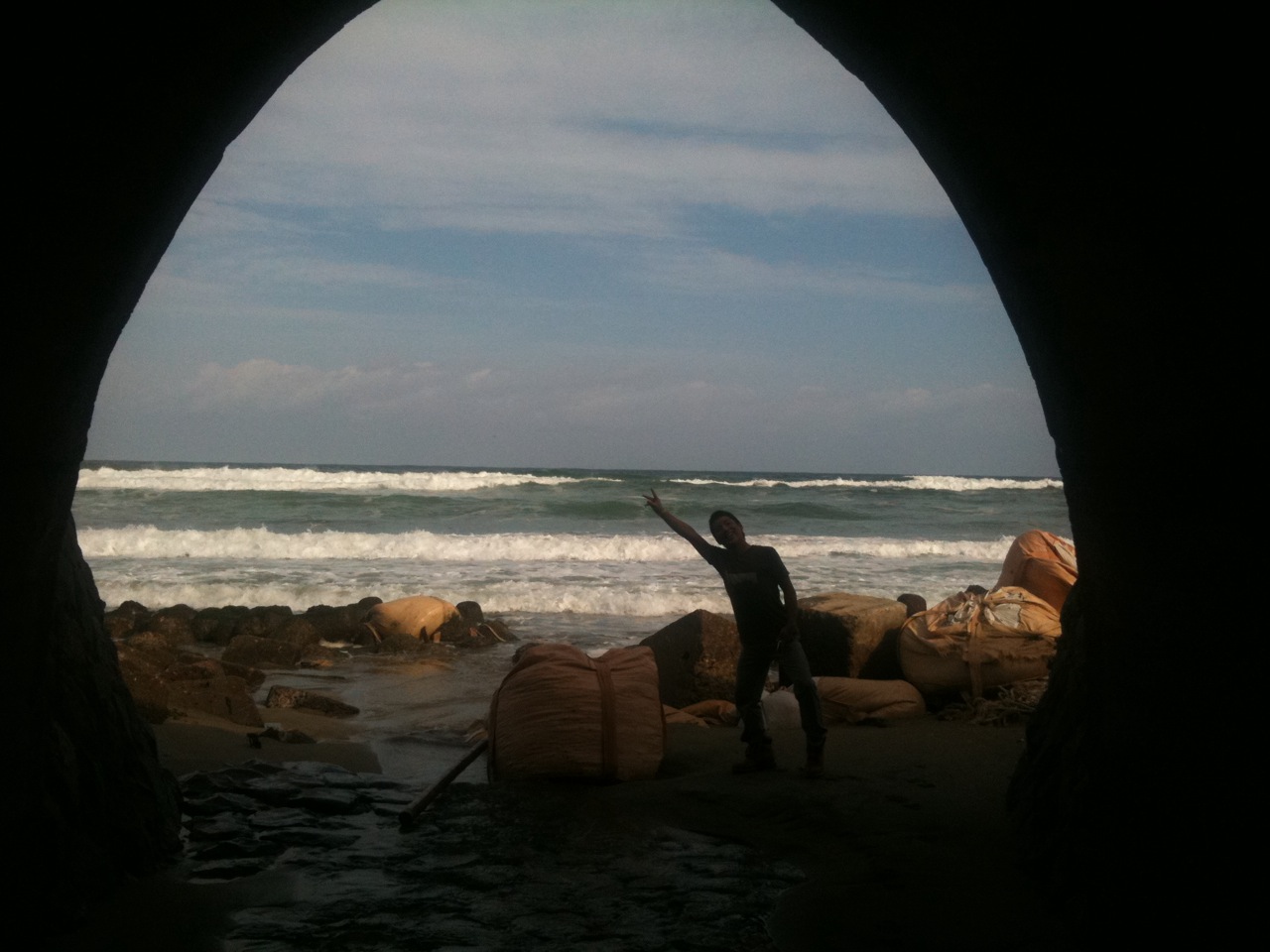 線路の下のトンネルを抜け、サーファーズ ガーデン竹中オーナーの愛息子「ジョーイ」と波チェック!Update from iPhone by NIShi…