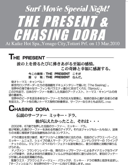 3月13日(土)に鳥取県皆生温泉にて皆生まつうらサーフギャラリー主催のサーフムービー上映会が行われます。是非お近くの人はチェックして見て下さい!