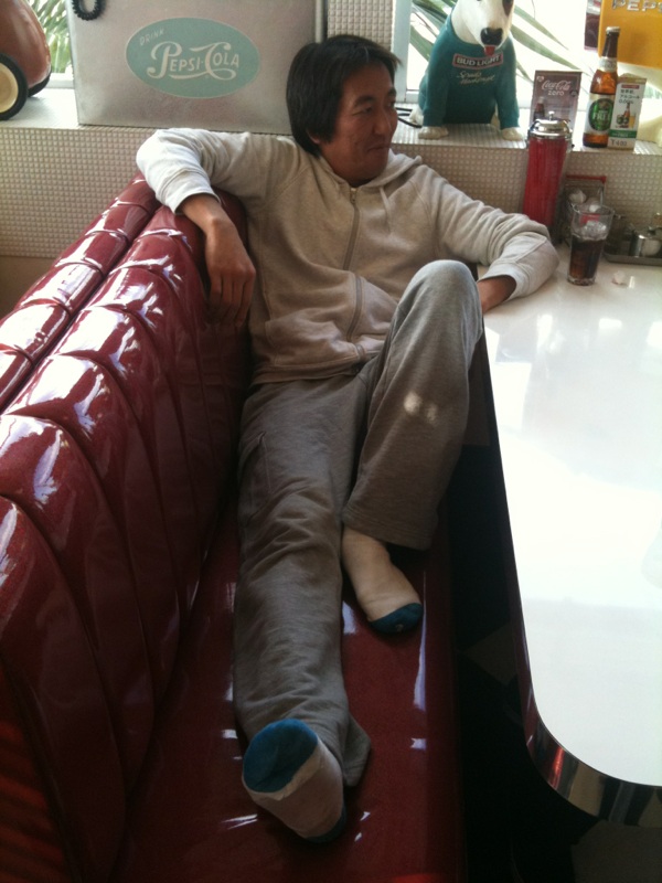 半笑いでカワイイ靴下履いてますね。