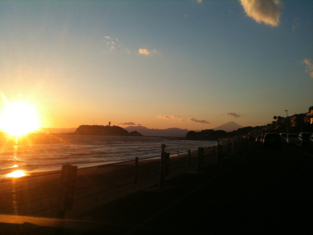 お店の前から見える夕焼け! 江ノ島の向こうには富士山が綺麗に見えます。