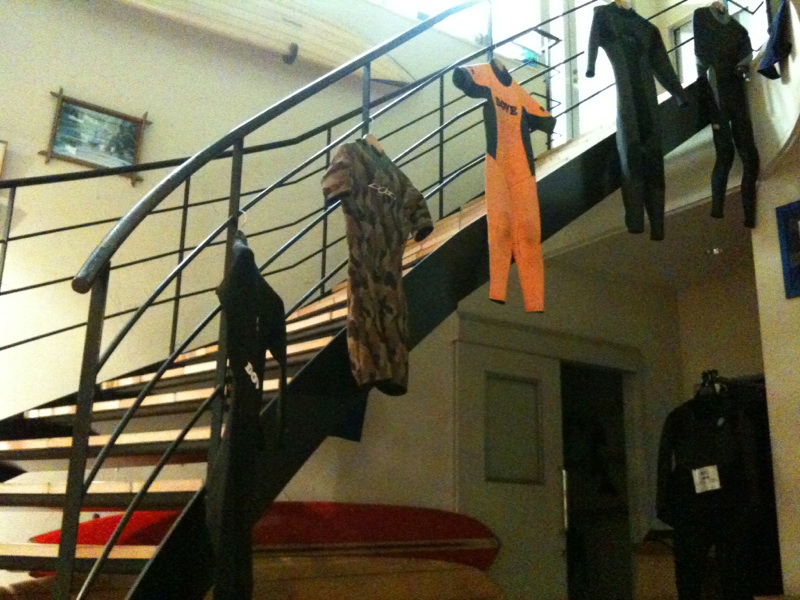 2Fに上がる階段の手摺には35年歴代のウェットスーツ達[:love:]