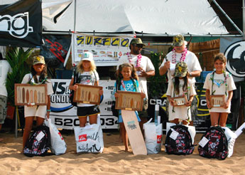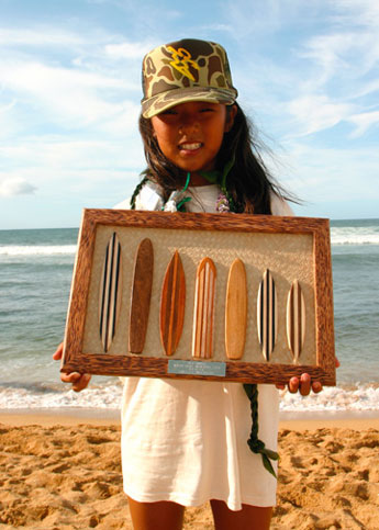 先月 ノースショアのハレイワで開催された 第31回メネフネサーフィングコンテストで サンセット在住 前田マヒナ(9才)が 7〜9歳 ガールズショートボードで みごと初優勝した。