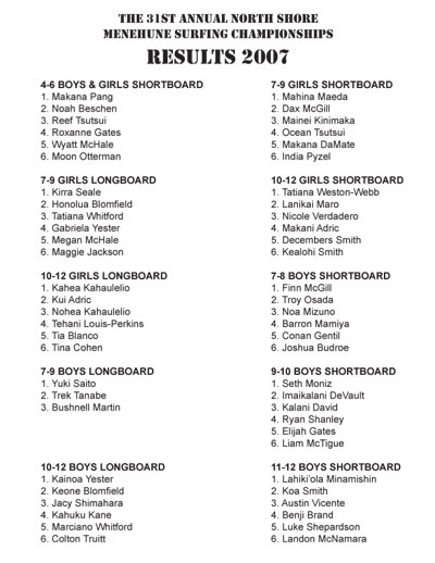 パンチョ サリバンをはじめ 現在活躍中のハワイ出身のプロサーファーは 必ずと言っていいほど 子供の頃にこのメネフネに出場し入賞している。