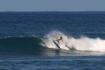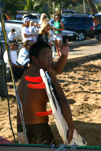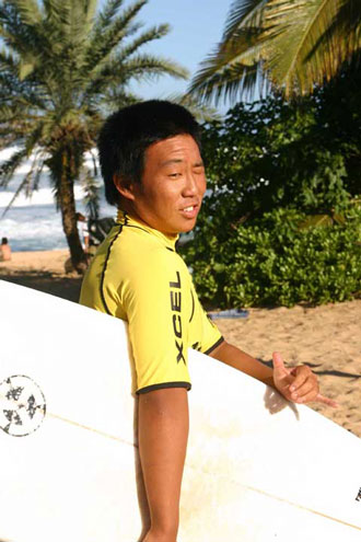 その大会に出場したダブチームのケオニ野崎を今回は紹介しよう。彼は同じくダブチームのビッグウェーブライダーニック野崎の長男で1990年4月21日生まれの16歳サンセットビーチ在住。もちろんホームブレークはサンセットビーチ。近頃ではパイプラインにも顔を出し将来の有力パイプライナー予備軍のジャパニーズハワイアンである。