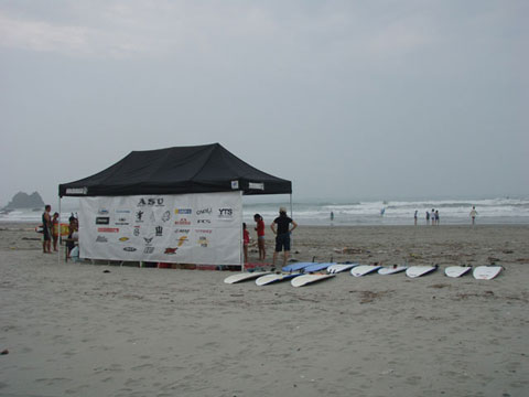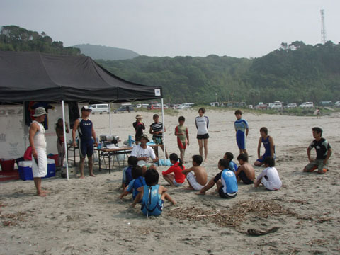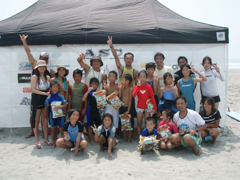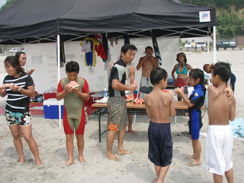 先日8/12(土)に東海地区の25のサーフショップによる愛知サーフユニオンが田原市大石海岸(通称、赤羽根ロングビーチ)において親と中学生、以下の子供を対象にサーフィンの体験&スクールを開催しました。 参加したのは、小学2年生から6年生の12名の子供達とその父兄3名。今回がユニオンとしても初めての試みであり参加人数は少なめでこの活動がスタートした。全員そろったところで、ビーチクリーンを参加者全員で実施。子供達は海に漂流しているゴミの量にびっくりした様子!初体験のゴミ拾いでいい汗をかいた。ヨガ式ストレッチの後、大人1グループ、子供3グループに分けいよいよサーフィン体験!まずは、陸上でのトレーニングをする。サーフィングの基本であるパドリングやサーフボードに立つ動作など陸上でレクチャーを受けた。一人ずつ講師と伴に浅瀬まで移動しサーフボードに立つ練習を繰り返す。すると最初は波にひっくり返されていたのが、ヒザ立ちで少し立てるようになり次第に岸まで乗って行く子供達が時間をおうごとに増えていった。さすがに子供達は飲み込みが早い!その光景を横目に必死だったのは親たち!必死な顔が印象的だった。休憩時間は、ギンギンに冷えたスイカで喉を潤した。サーフィンの感想を子供達に聞いた「すごく楽しい」「サーフィン初める!」などうれしい感想をもらった。