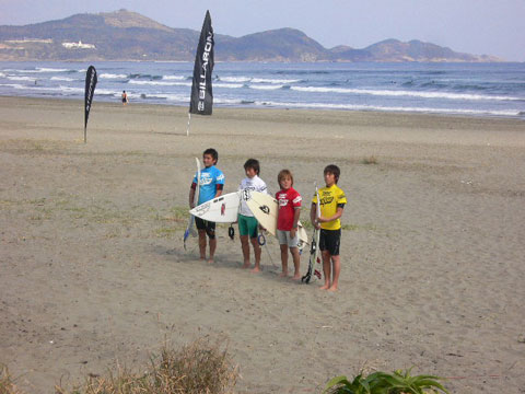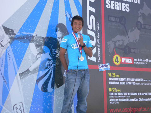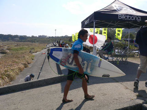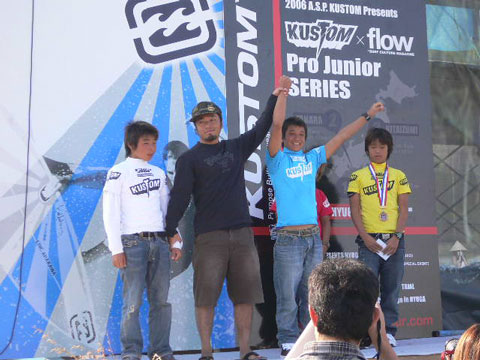 今回のクラスは20歳以下のジュニアクラス、16歳以下のキッズクラス、そしてガールズクラスと3クラス、いずれもかなりレベルの高いコンテストでした。プロアマ混同で行われましたが、プロ顔まけのライディングを疲労してくれたスーパーキッズ達、なかでも小学4年生の中村たくみ君はオフザリップ3連発からのフィニッシュはエアリアルなどかなり高度な技を見せ付けていました。そしてダブチームからは和光大選手、大きなトップでのカービング、そして速いリッピングを巧みに使い分け前半から7点台をマークしました。その後をこれまたスーパーキッズの田中カイシュウも6点台を出し追い上げてきましたが、後半には和光大が速いリッピングで6.5ポイントを出し2位以下を大きく離し優勝を決めました。そしてジュニアプロでは宮崎の萩原シュウ、が安定したライディングで優勝を決めました。萩原選手はファーストアクションで常に高いスプレーをとばしジャッジにアピール、高ポイントを出し優勝を決めました。惜しくも2位には高橋ケント、バックサイド特有の早い返しを3〜4発連続で出しますが5,5ポイント2本を出しましたが惜しくも2位どまりでした。 昨年にも引き続き波は良く選手、ジャッジ、観客ともに見ごたえのあるコンテストだったようです。