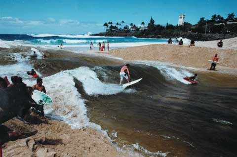 この写真は、ハワイのノースショア−ワイメアポイントにて撮影された場面です。このショットを取られたのは、山梨県にあるサンディービーチのオーナー山中さんがノースショア−に行った時に偶然に撮った珍しいショットです。山中さん言わくほんの10分位の出来事で最初は、5メートルの狭い川幅の中でボディーボードをしていたのが段々川幅が広がるにつれサーフィンボードでトリミングしライディングするサーファーを撮った貴重なショットです。