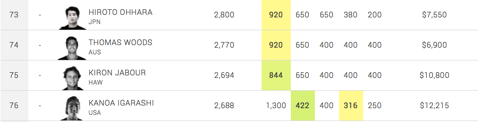 大原ヒロト選手の73位、次にカノアイガラシ選手が76位。