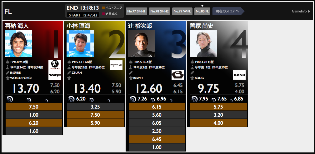 あと1戦を残して、3位の辻裕次郎選手がランキングトップを独走中です。