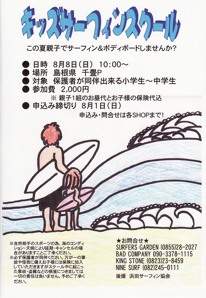 今週、日曜に島根県(千畳P)にて親子でサーフィン&ボディーボードを楽しむ『キッズ サーフィンスクール』が行われます!!当日は、サーフィン指導だけでなく、海のプロフェッショナルな先生方が海の知識と危険性・保護者への指導方法 […]