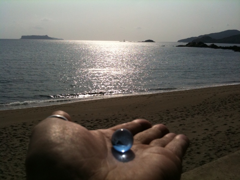 久々に飲んだ、ラムネのビー玉に太陽のパワーを注ぎ込み中〜。逆光で、海の綺麗さが伝わらない…Update from iPhone by dove NIShi…