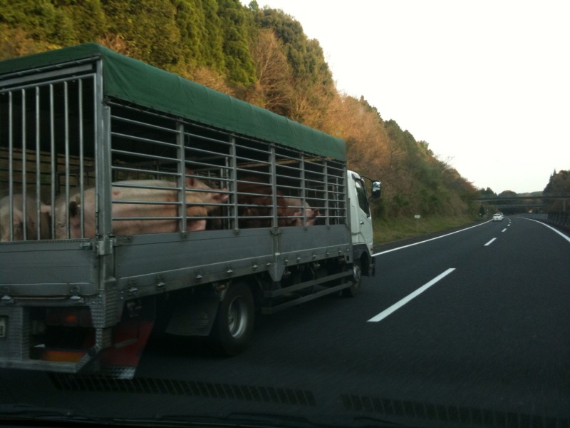 熊本から鹿児島に向う途中、ベイブカーに遭遇。。。白豚の中に黒豚が一匹。しかも、デカい!可愛い?飼いたい?恐い?美味しそう?Update from iPhone by dove NIShi…
