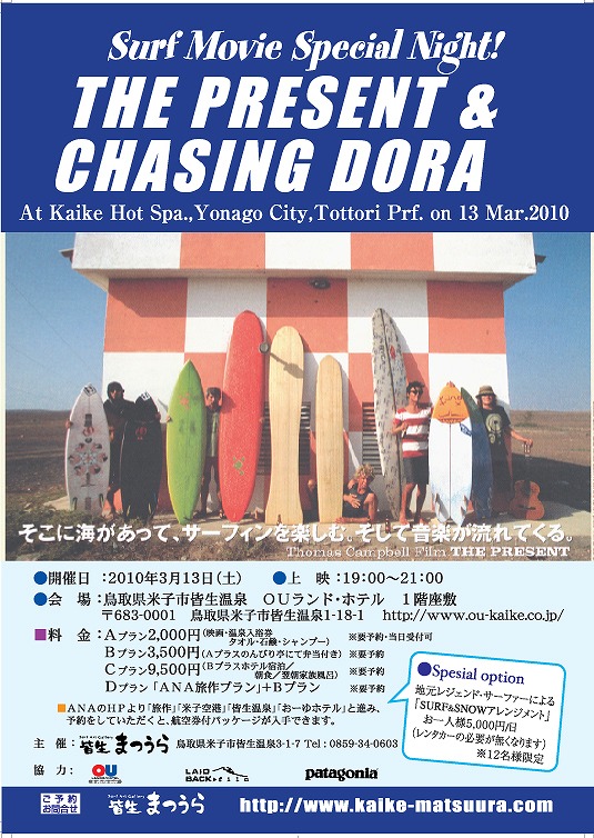 3月13日(土)に鳥取県皆生温泉にて皆生まつうらサーフギャラリー主催のサーフムービー上映会が行われます。是非お近くの人はチェックして見て下さい!