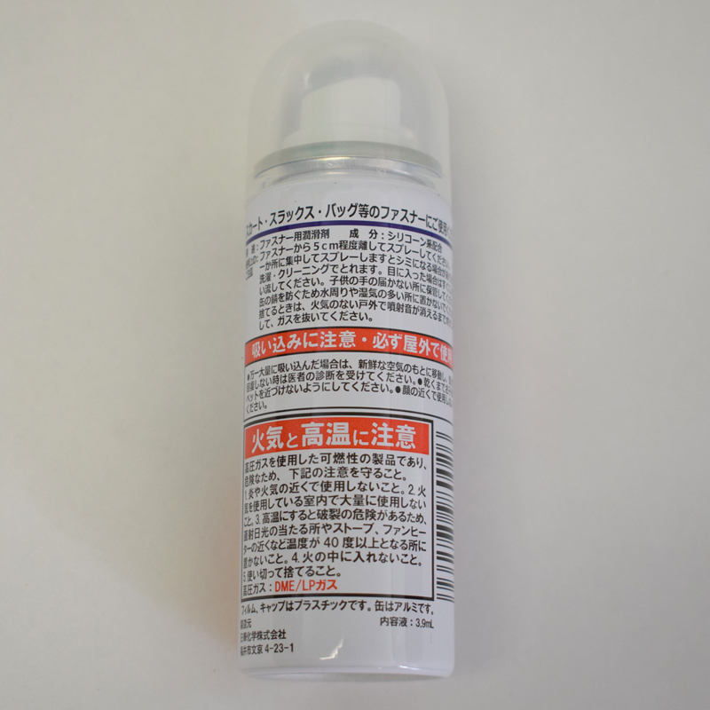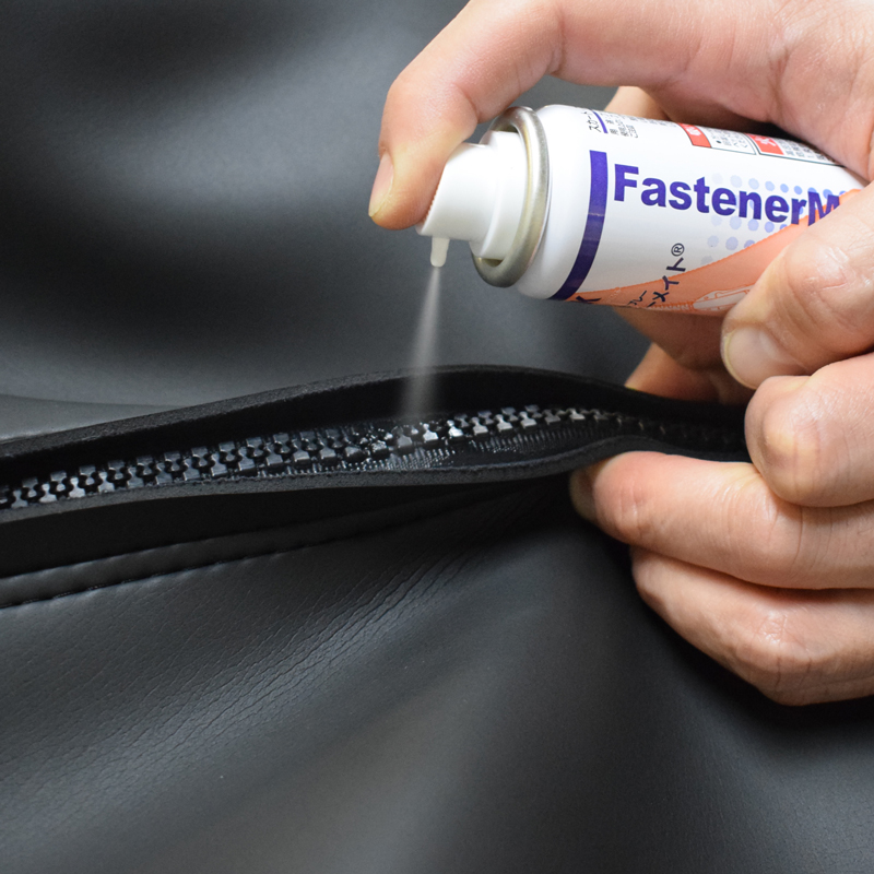 すべりの重くなったファスナーに直接スプレーするだけで瞬時にスムーズなすべりを回復させます。