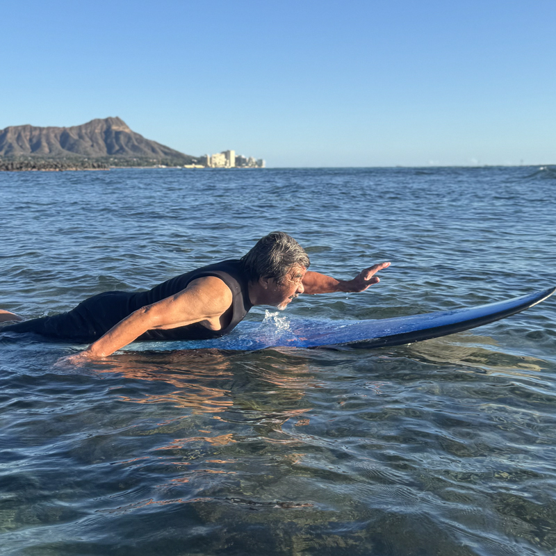 首や背中への負担を軽減し、サーフボードを胸で押しやすくすることで、スムーズなテイクオフが可能に。