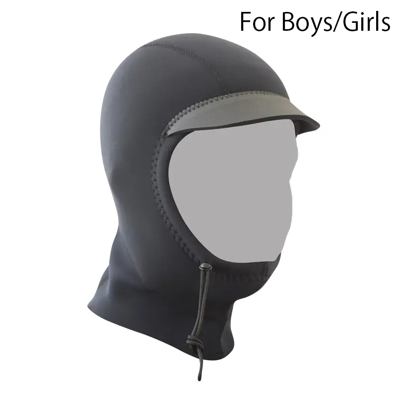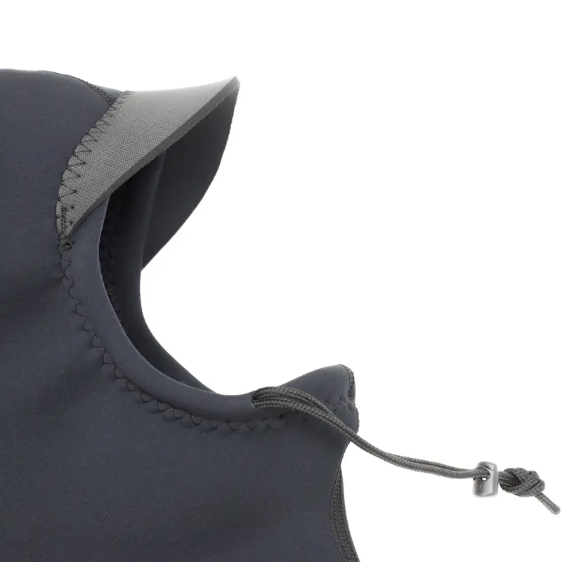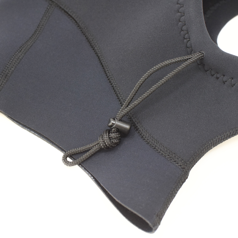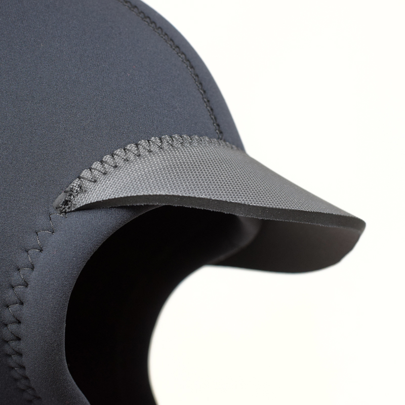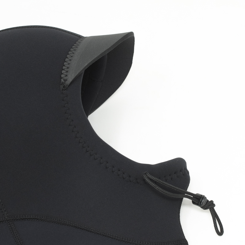 顔回りのコードを絞る事で顔からの水の浸入を軽減できます。ツバがついてる為被った際の見た目も良く、日差しを遮ります。1mmと生地が薄いためサーフィン中にパーカーのフードのように後ろに垂らすことも可能です。