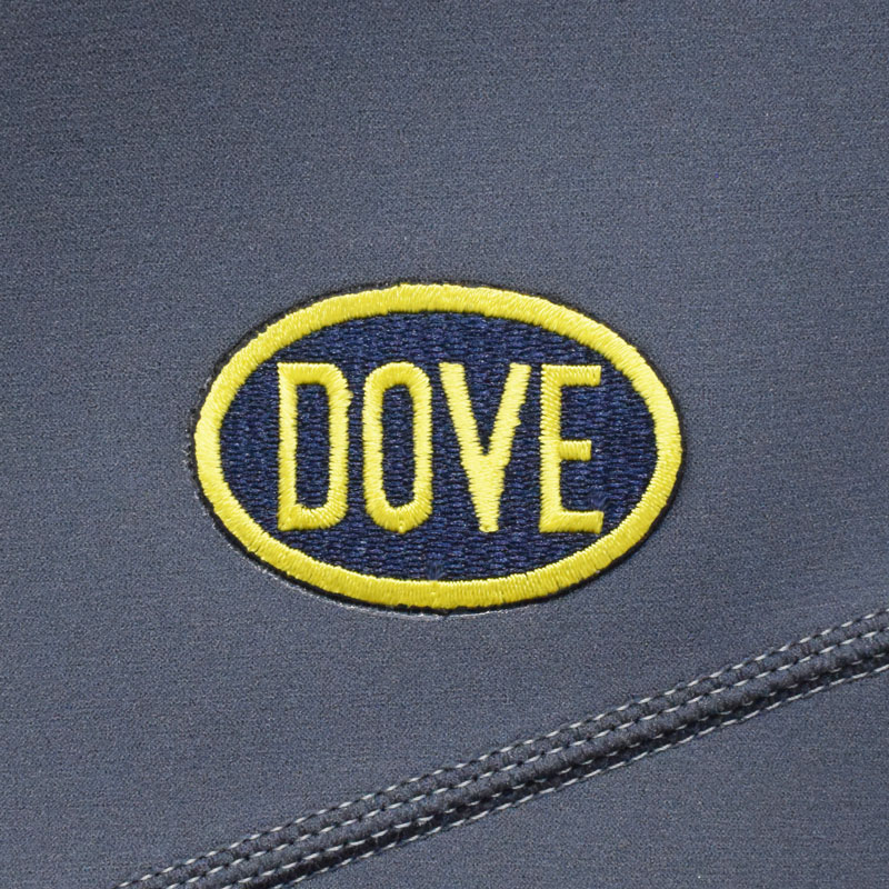 ■DOVEオリジナルデザイン:左胸には定番カラーのワッペン、右腰にはD-lite専用ロゴ入り。