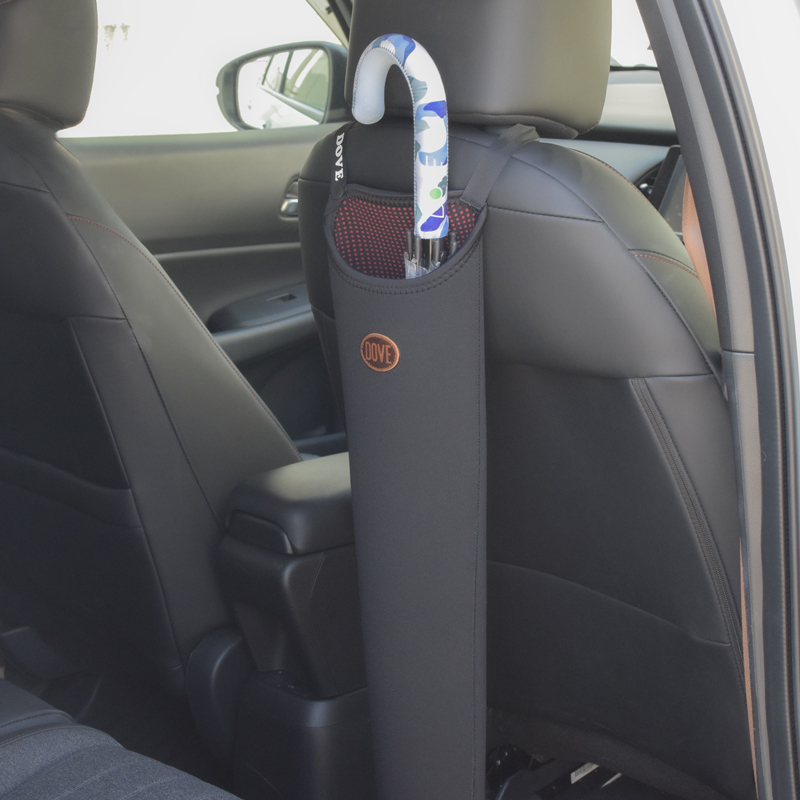 ヘッドレストに取り付けられるストラップを使って簡単装着。最大傘を3本収納できます。コンパクトに小さく収納でき、梅雨の季節にとても便利なアイテムです。