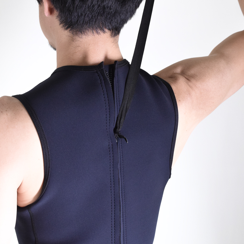 ■バックジップ仕様:背面に縦ファスナーを配置し、スムーズな着脱が可能。