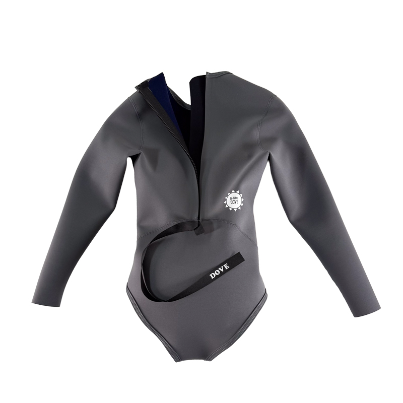 ■ スタイルを美しく魅せるハイレグ×ロングスリーブの組み合わせは、夏にぴったりのデザイン。背面には縦にファスナーを配置し、肩まわりの動きを妨げず、着脱もスムーズなバックジップ仕様です。