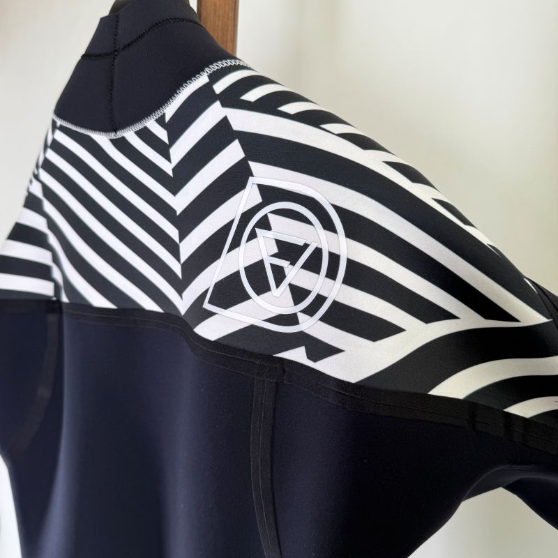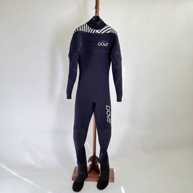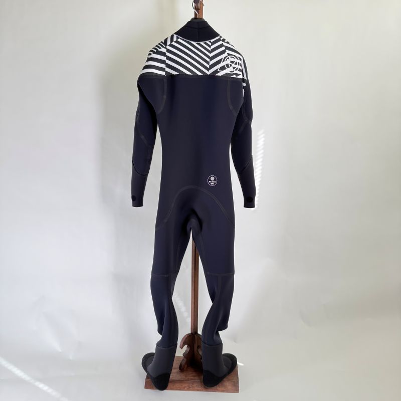 防水ファスナーは伸縮が無いのでスーツ本体は胸、脇周りに余裕を持たせた作りになります。