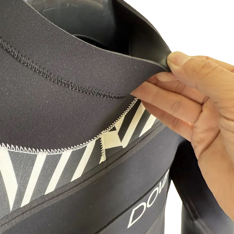 防水ファスナーは伸縮が無いのでスーツ本体は胸、脇周りに余裕を持たせた作りになります。