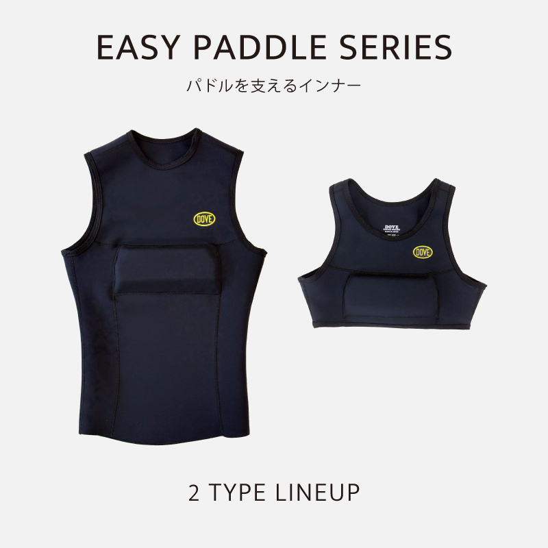 ■DOVEオリジナルデザイン:左胸には定番カラーのワッペン、背中中央にはEASY PADDLE専用ロゴ入り。