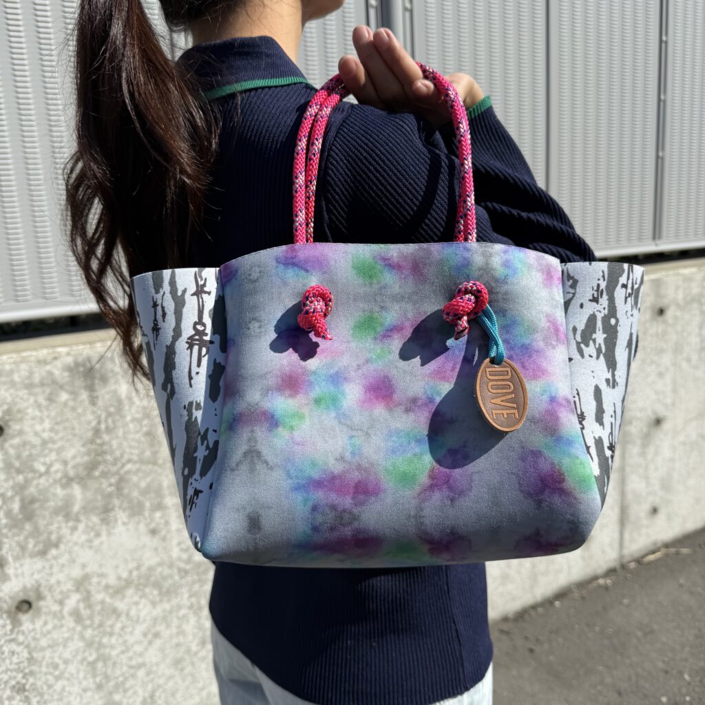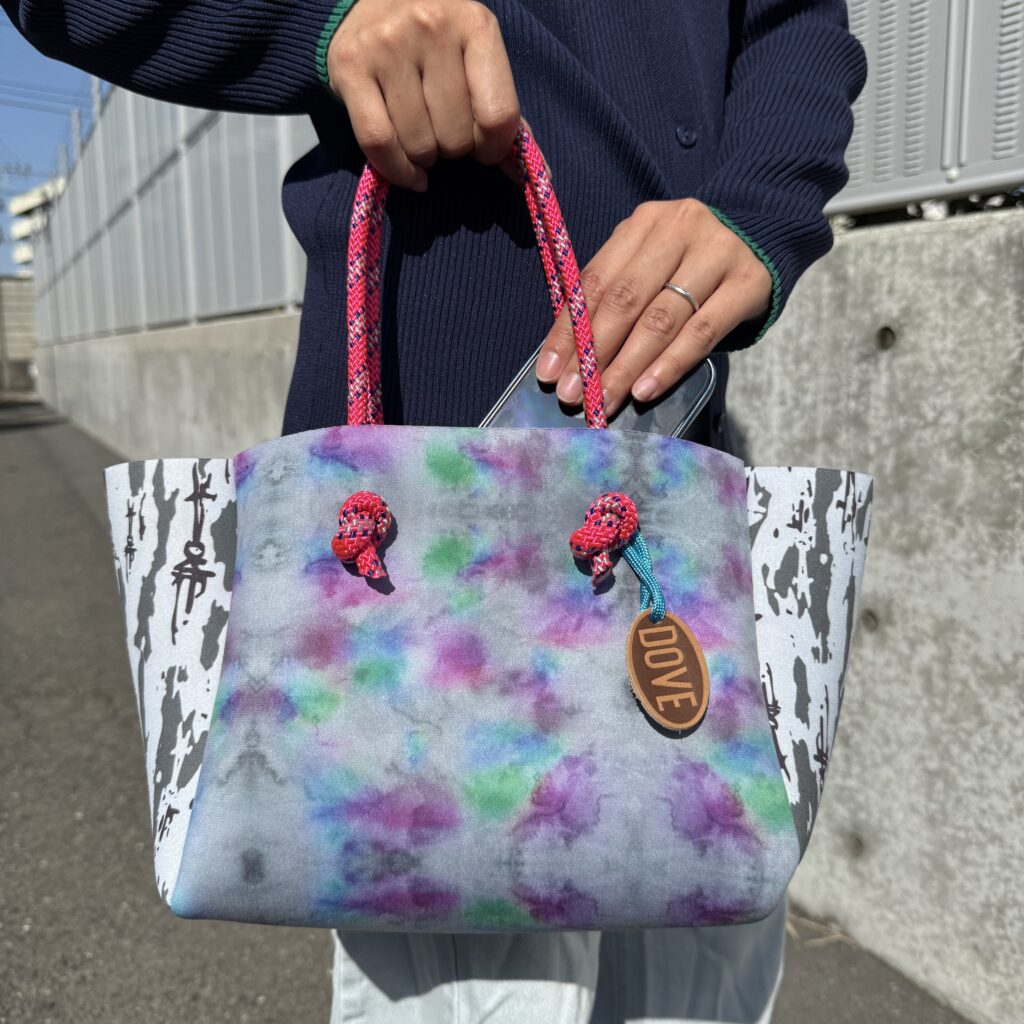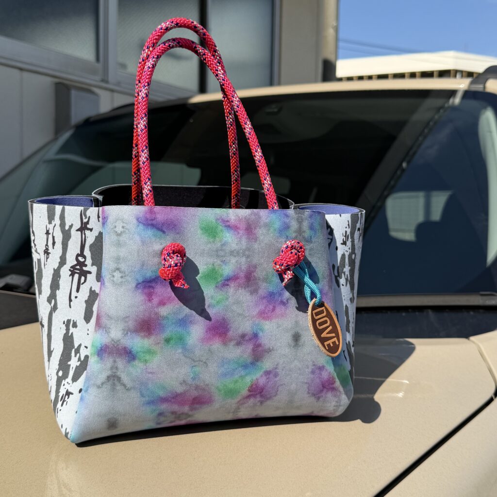 ウェットスーツに使用されるネオプレン素材の廃盤生地や端材をアップサイクルして生まれた、DOVEオリジナルのサステナブルバッグ。