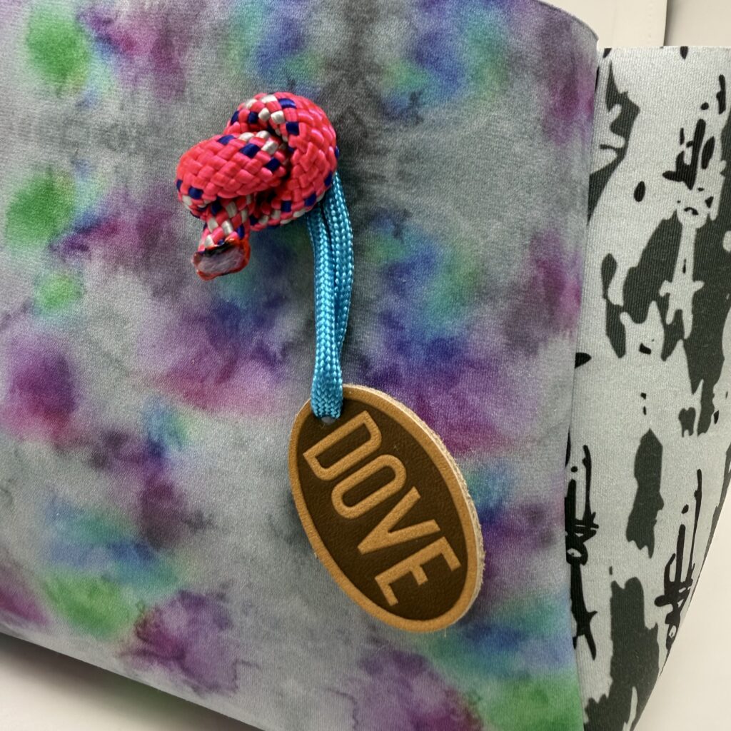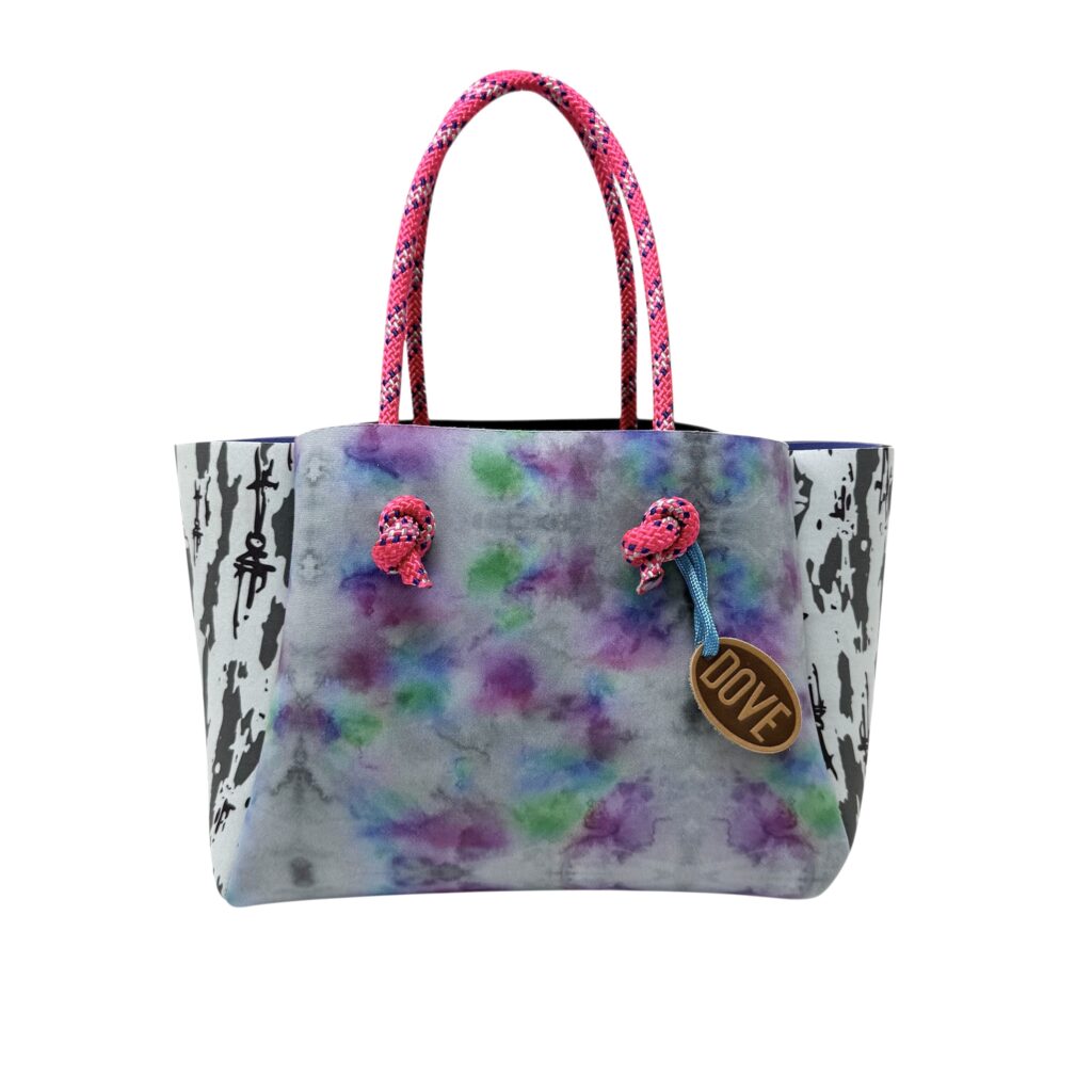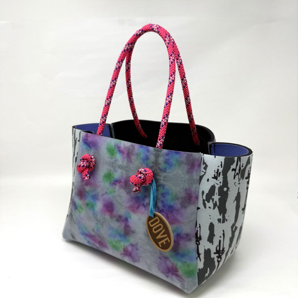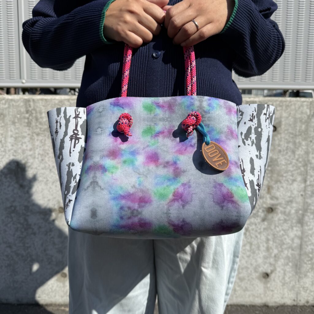 ウェットスーツに使用されるネオプレン素材の廃盤生地や端材をアップサイクルして生まれた、DOVEオリジナルのサステナブルバッグ。