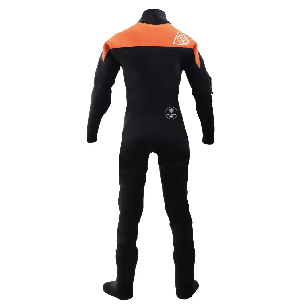 スーツ内に空気が溜まりやすいので身体を縮めた状態で首からの空気抜きが必要となります。また、胸くらいまで水に浸かった状態で首を広げて空気抜きも可能です。