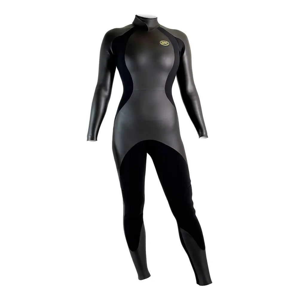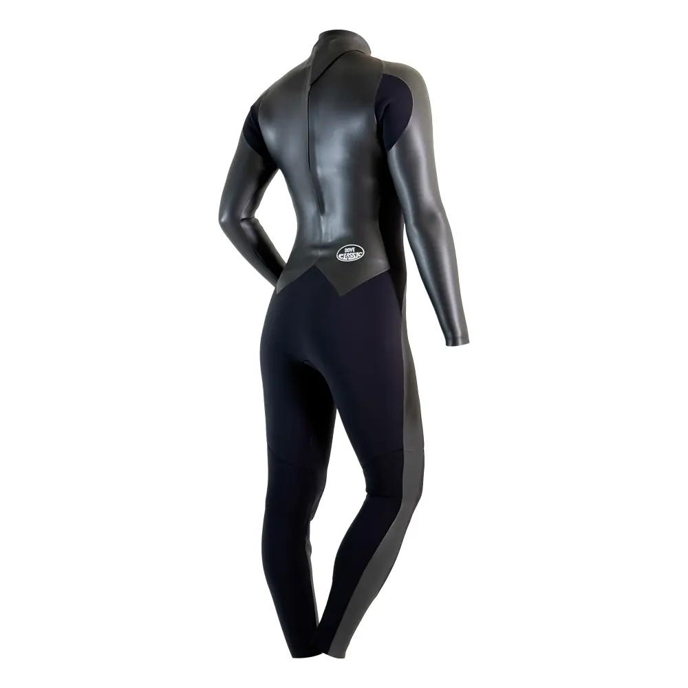 背面に防水ファスナーを備えたバックジップタイプ。スムーズな着脱を実現し、肩まわりの動きを妨げず快適なフィット感をキープします。胸囲や腕まわりにファスナーがないため、全身が自然にフィットするシルエットに仕上げています。ファスナーには専用のジップアップテープが付いています。
