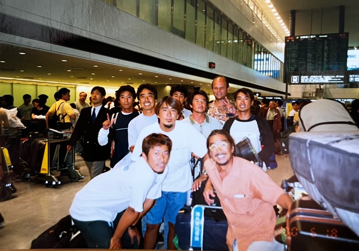 サーフボード8ケースで計35本、スーツケース8個と軽く重量オーバーで50万円のチャージ料を飛行機会社から請求されたが、あの手この手で、1時以上の格闘の末フリーとなった。今では考えられない出来事だ。成田空港を出発前に未開地マダガスカルのバージンウェイブをサーフィンする楽しみを想像しながらいざ出発のメンバー。