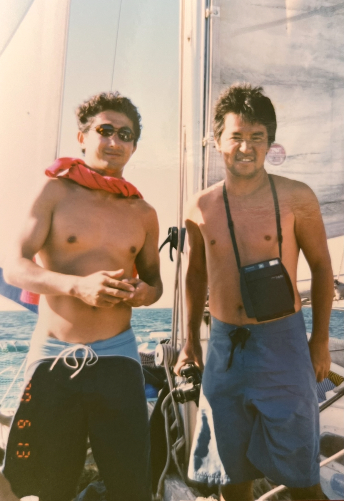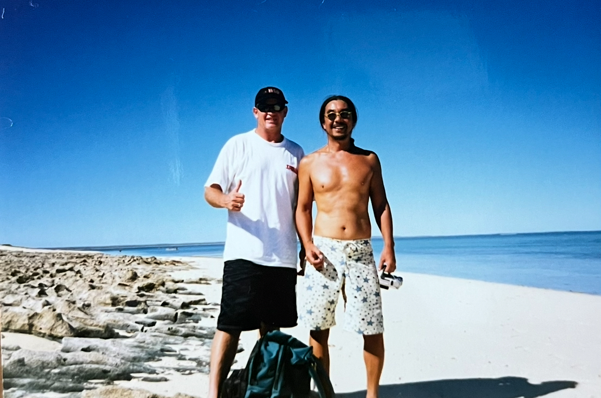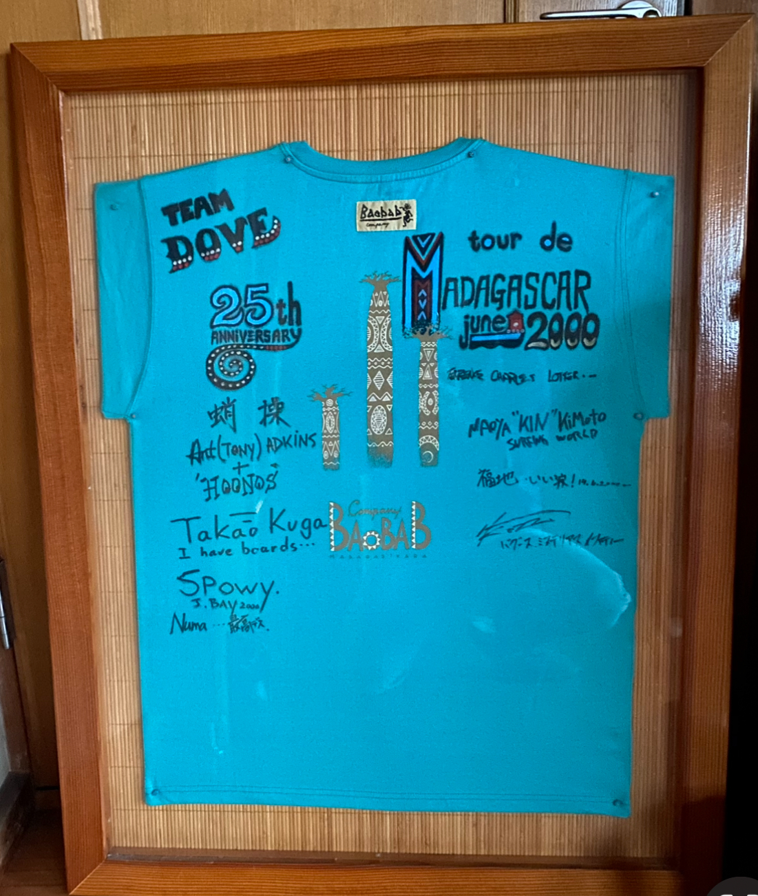 サーフアーティストとして、この旅を楽しでいた、テレンスローター、ダブウェットスーツの25周年記念を雑誌の広告と記念に皆んなのサイン入りのTシャツにデザインしてくれた。