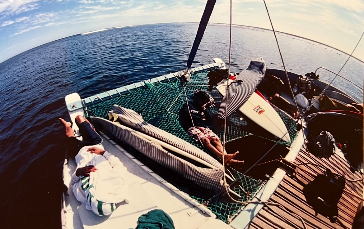 大潮が近づいて、潮が引きすぎて、潮が上げるの待つ時間が長いので、カタマランの先端のネットの上は、極上のベッドに早変わり。